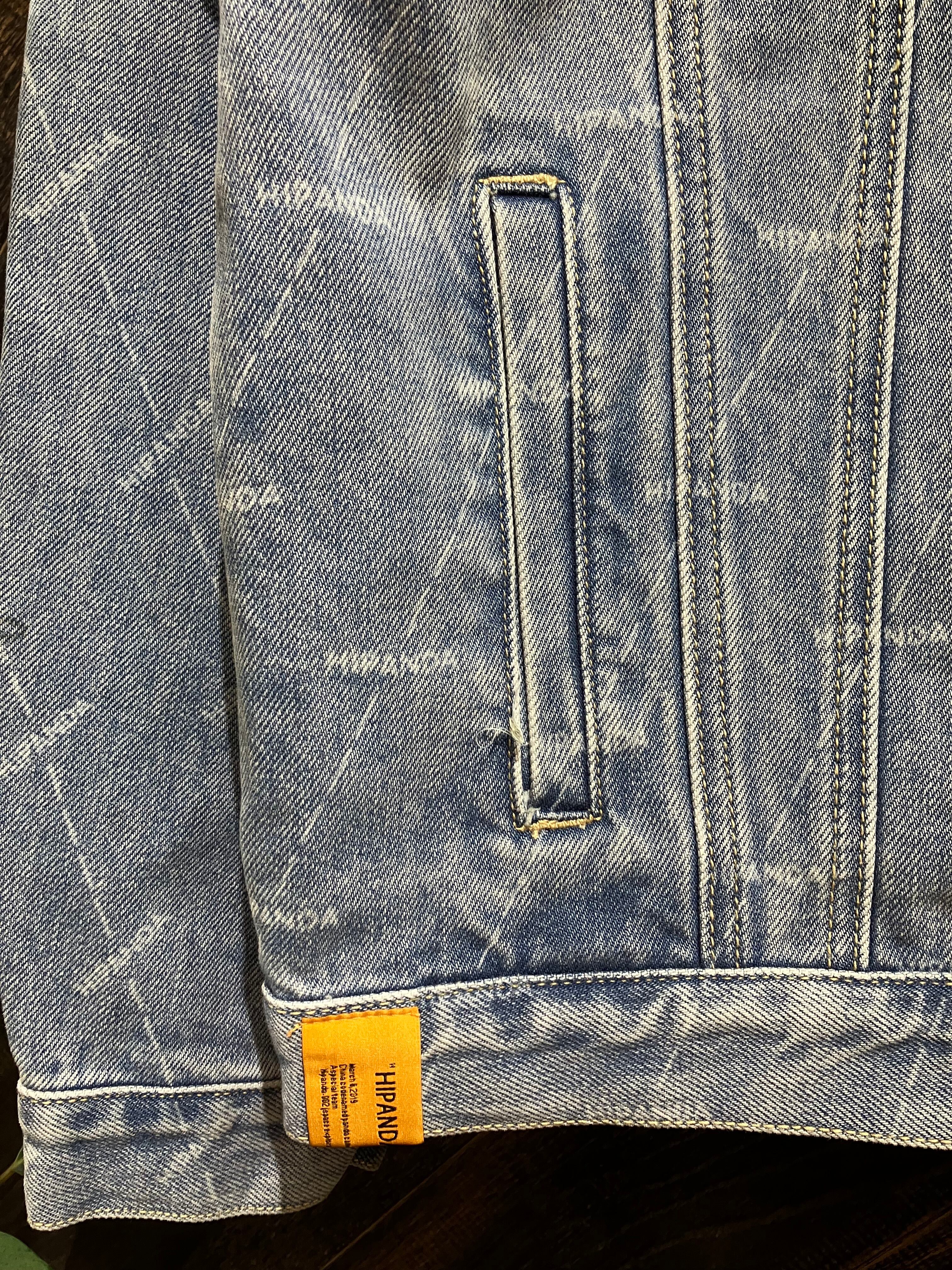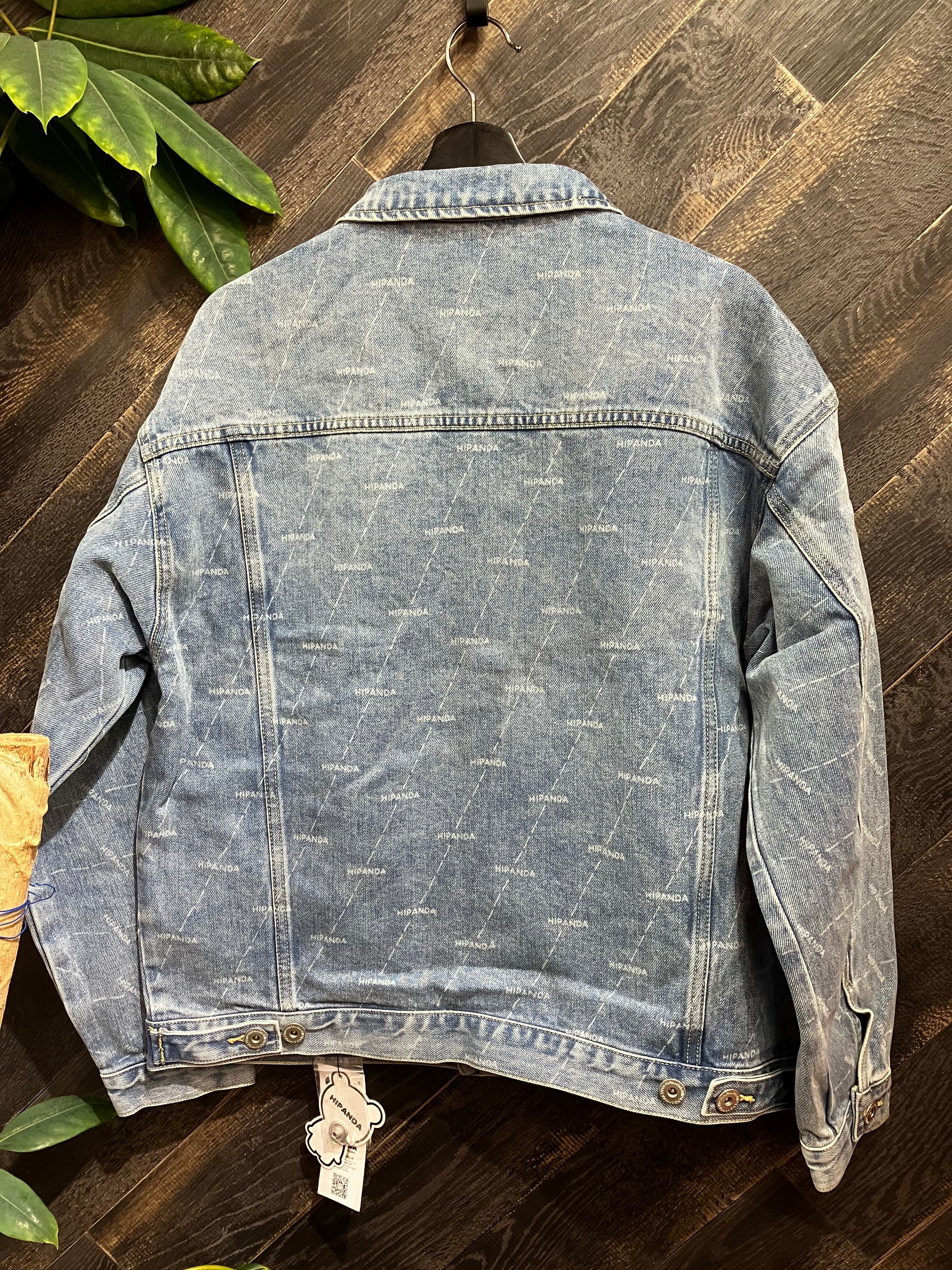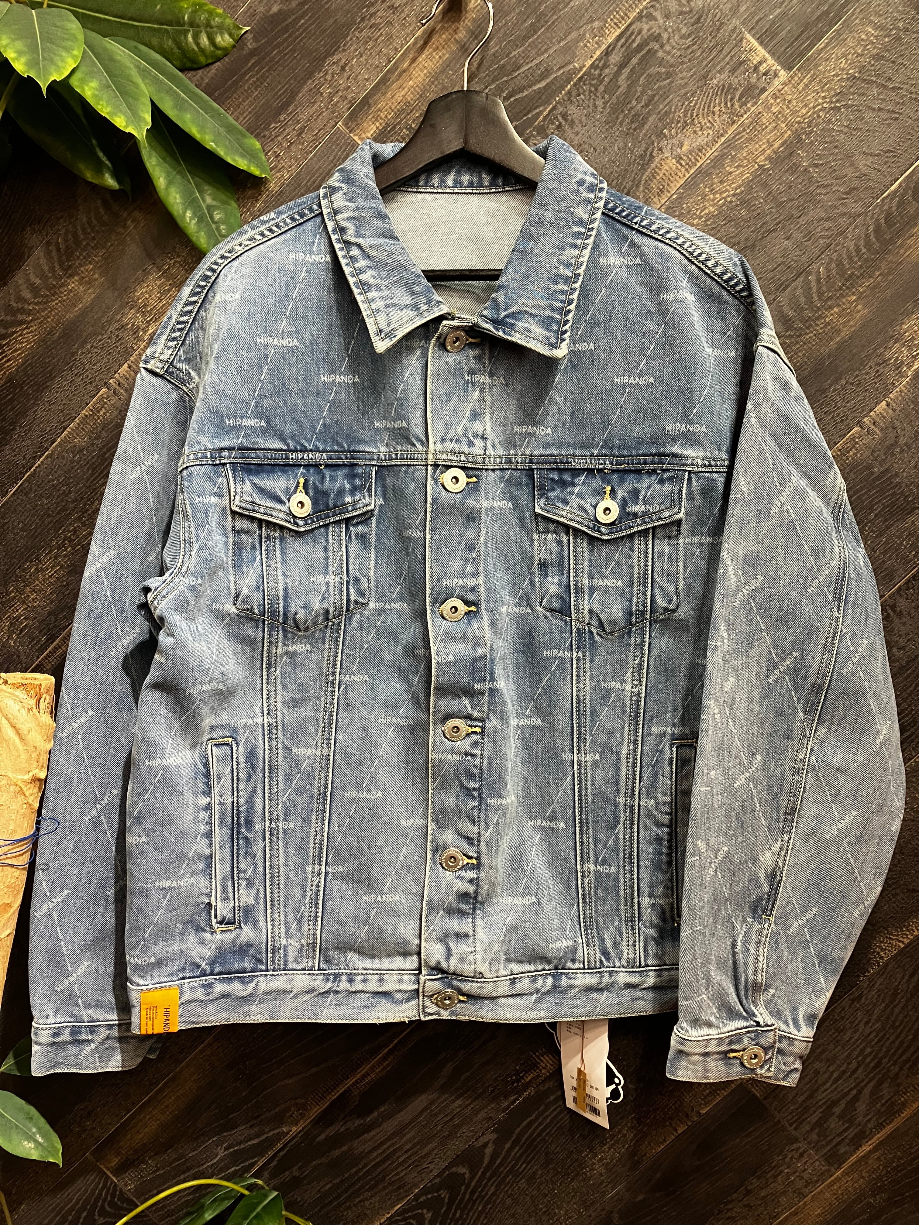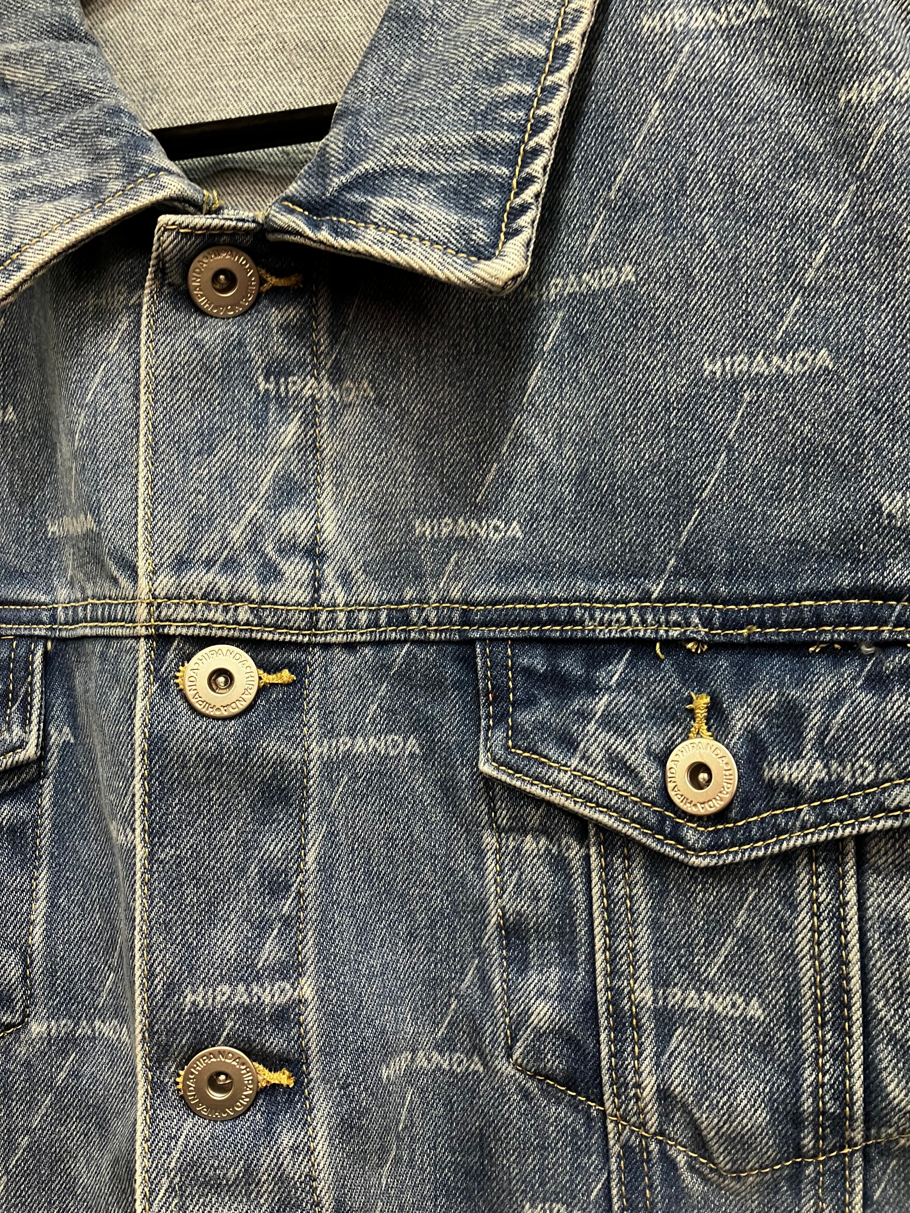 小さいロゴが散りばめられているデザインのデニムジャケット。