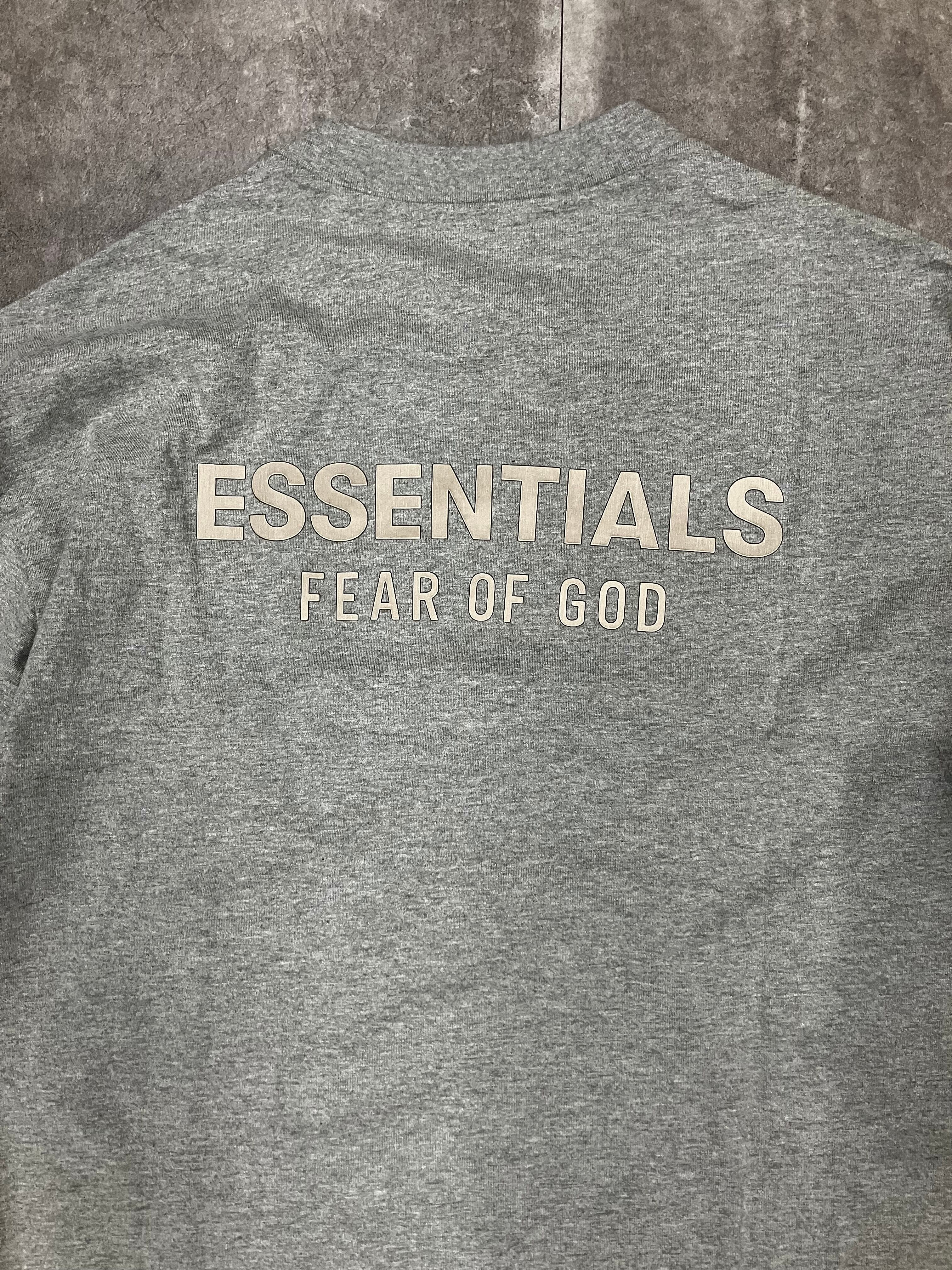前面中央に「Fear of God Essentials」のラバー加工ラベル、背面には新しい「Essentials Fear of God」のベベル仕上げのメタリックロゴが配されています。
